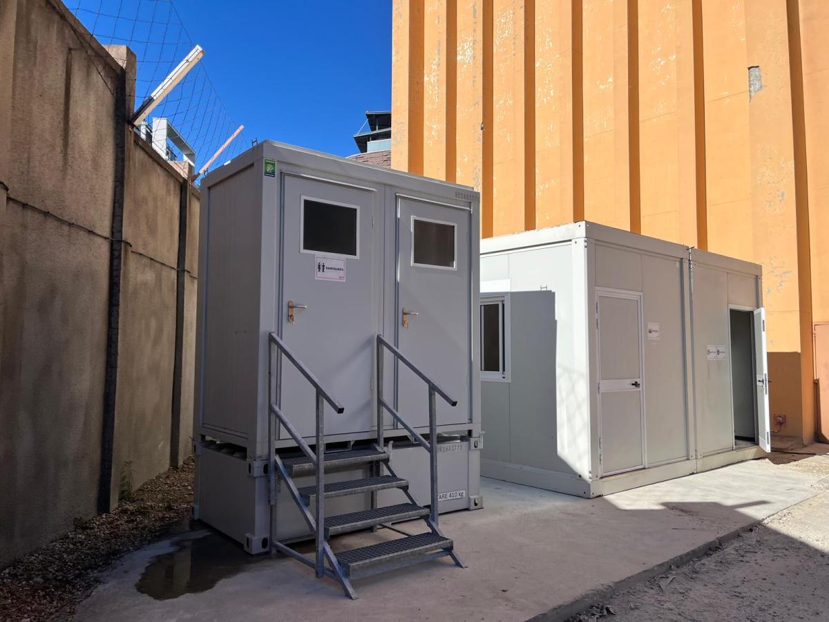 Entièrement livrée et installée sur site, la structure est prête à l’emploi dès sa mise en place. Elle est équipée de mobilier fonctionnel, comprenant des armoires doubles, des tables ainsi qu’une kitchenette, offrant un espace à la fois pratique et convivial pour les utilisateurs.